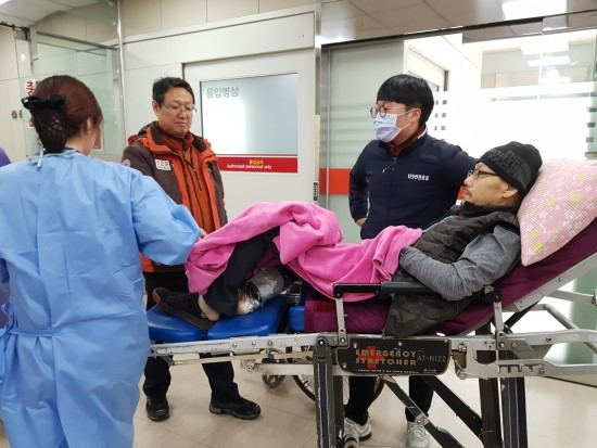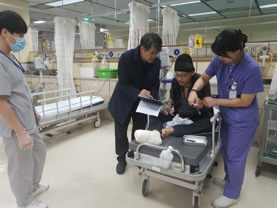 도착 후 구급차로 한림병원 응급실로 후송 후 현재 입원 중이며, 담당 주치의는 무릎을 절단해야 한다는 진단을 내리고,