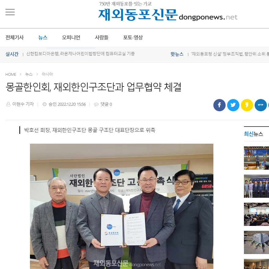몽골한인회, 재외한인구조단과 업무협약 체결